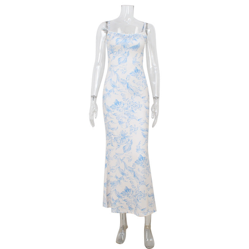 Vintage Printed Slim Fit Slimming Spaghetti Straps Dress
